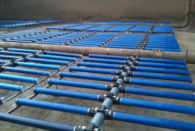 曝气装置由曝气器、布气管道、三通、四通、弯头、调节器、连接件、清除装置等组成。布气管道按通常的环形布置,曝气器按供气量和池形布置密度,曝气器和布气管道的连接采用G3/4螺纹连接,底座为内螺纹(固定于布气管道上)曝气器为外螺纹,安装时先把调节器按所需尺寸用膨胀螺栓固定在池底,然后用抱箍把布气管道固定在调节器上,为防止其它作业如电焊火花和土建时,混凝土等重物损坏曝气装置,必须等土建工程结束后在放水前把曝气器装上,为防止管道和连接部分漏气,应放水超过曝气器10cm左右底深度试漏,然后通气如发现有管道连接部分漏气应及时排除,然后正式投运。
