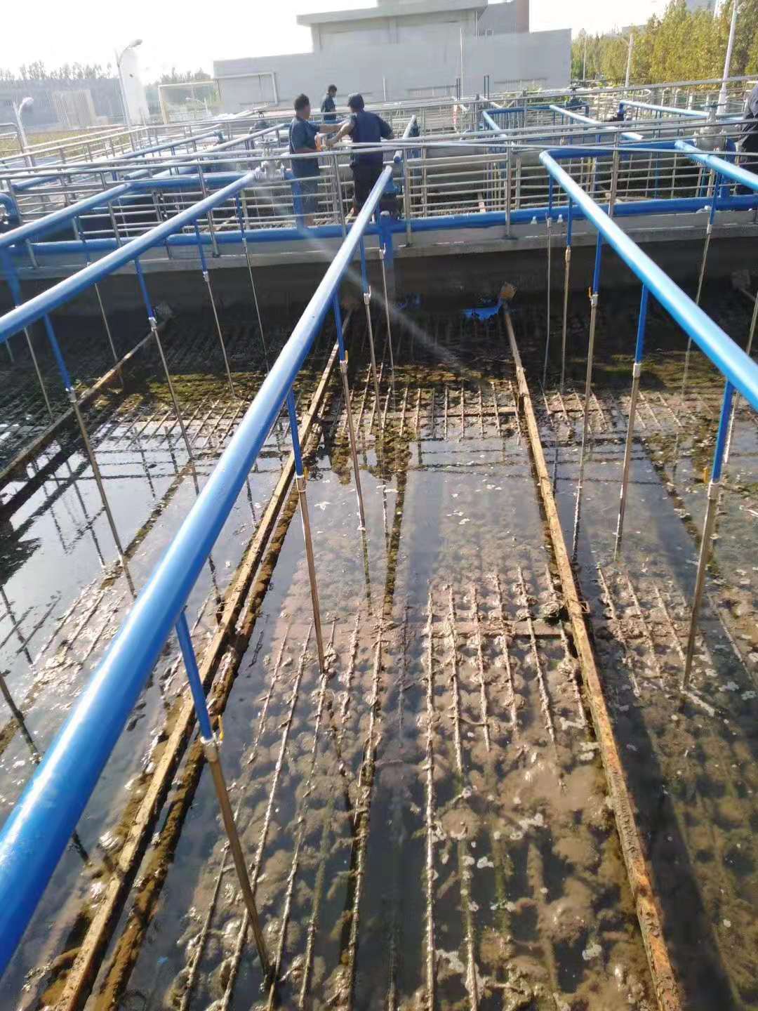 客户单位工况现状:好氧池曝气系统目前安装底部微孔曝气器,一方面因为使用时间过长造成了大面积堵塞及损坏,溶解氧过低已经无法满足污水后续处理要求,另一方面因为好氧池中装有填料,且重新更换池底微孔曝气器需要排水,极大的增加了更换难度和更换成本。